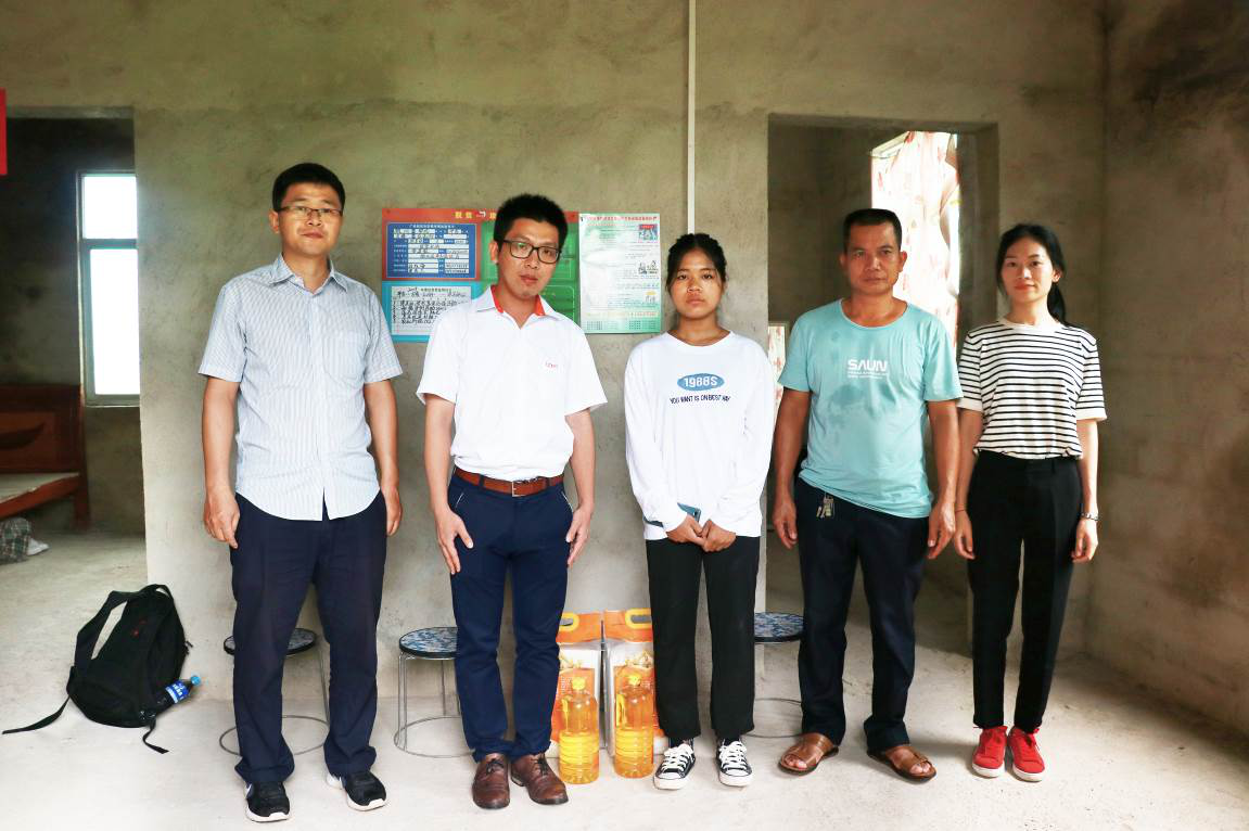 欽州當?shù)胤鲐毑块T干部、播恩代表人員與梁美麗同學(圖左三)合影