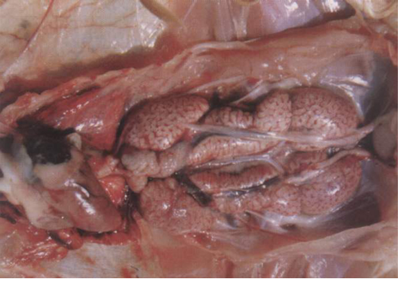 2.2.3腎型傳支:主要見于20~50日齡的仔雞,病初呼吸困難(但較呼吸型輕微),2~4天后消失,羽毛逆立。隨后急劇下痢呈米湯樣白色稀糞;腎臟腫大蒼白,呈檳榔狀花紋(俗稱檳榔腎),輸尿管內(nèi)充滿白色尿酸鹽。病程15天左右死亡率高。