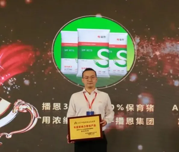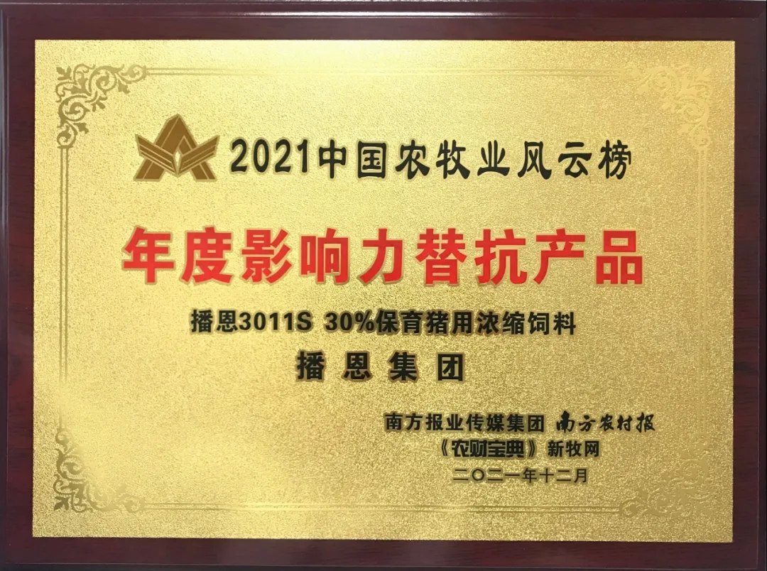 2021年12月11日,第11屆中國農(nóng)牧業(yè)風(fēng)云會、農(nóng)財寶典新牧網(wǎng)年會暨廣東省現(xiàn)代畜禽產(chǎn)業(yè)園研討會在廣州閉幕。在2021年中國農(nóng)牧業(yè)風(fēng)云榜頒獎會上,播恩集團產(chǎn)品“播恩3011S 30%保育豬用濃縮飼料”榮獲“年度影響力替抗產(chǎn)品”獎項,播恩集團技術(shù)服務(wù)副總監(jiān)巴少波上臺領(lǐng)取獲獎牌匾。
