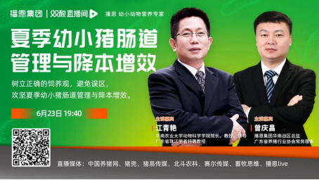 在6月23日晚19:40,40萬+養(yǎng)豬網(wǎng)友齊聚播恩雙酸直播間,共同觀看了第三十六期訪談式直播《夏季幼小豬腸道管理與降本增效》,期間中國養(yǎng)豬網(wǎng)、豬兜、豬易傳媒、北斗農(nóng)科、賽爾傳媒、蓄牧思維、播恩live七大平臺進行同步轉(zhuǎn)播,本期直播邀請了華南農(nóng)業(yè)大學(xué)動物科學(xué)學(xué)院院長/教授/博導(dǎo)/廣東省珠江學(xué)者特聘教授江青艷,播恩集團華南戰(zhàn)區(qū)總監(jiān)/廣東省養(yǎng)豬行業(yè)協(xié)會常務(wù)理事曾慶昌,共同分析探討豬場現(xiàn)象、腸道管理對幼小豬的影響、幼小豬飼養(yǎng)管理的關(guān)鍵點分析、腸道管理與降本增效四個方面,在豬價回暖的當(dāng)下,為豬場做好夏季幼小豬的腸道管理與降本增效提供有利的抓手。