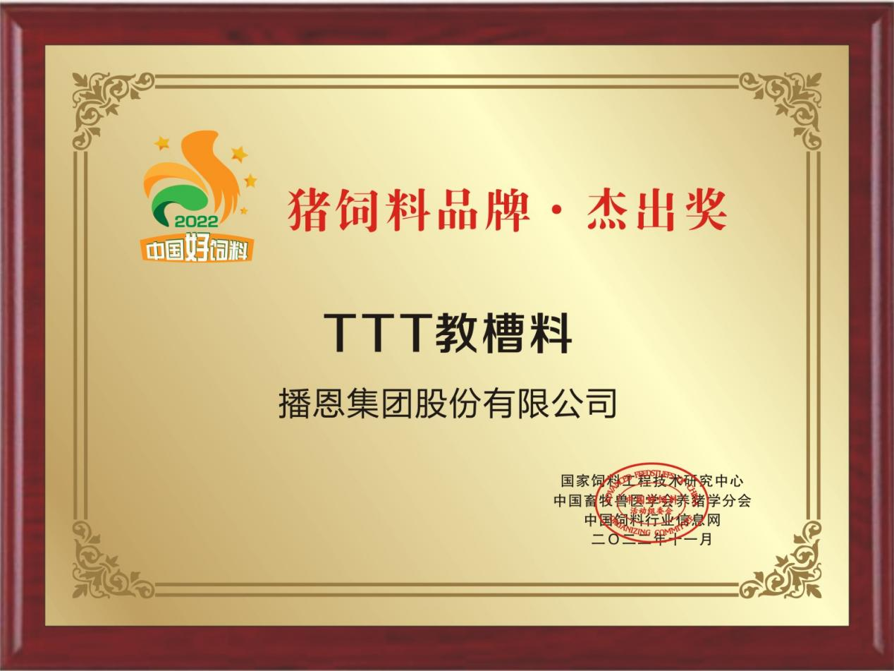 2022年12月3日,由中國飼料行業(yè)信息網(wǎng)主辦的“中國好飼料2022·頒獎盛典”順利舉辦。播恩集團“TTT教槽料”憑借自身的核心技術(shù),以及在教槽料市場上的優(yōu)異表現(xiàn),從眾多優(yōu)秀產(chǎn)品中脫穎而出,一舉獲評“豬飼料品牌·杰出獎”!