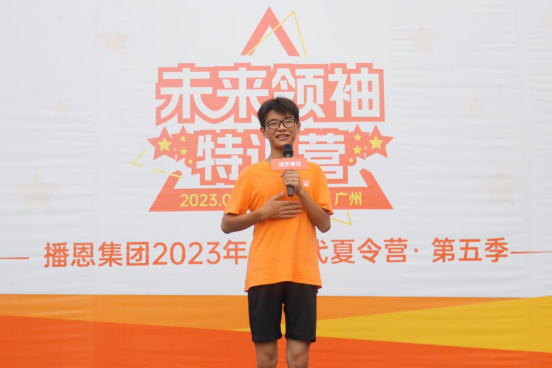 在學員發(fā)言環(huán)節(jié),本次訓練營的優(yōu)秀學員代表李凱旭同學上臺發(fā)表感言。跟隨家長的足跡,李凱旭很高興能親自走進播恩,切身感受播恩文化與工作環(huán)境。他期待著,在播二代夏令營“理想行動、擔當大同”口號的鞭策下,努力成為更好的自己,探索未至之境,暢游科學海洋,立志領(lǐng)袖夢想。李凱旭分享了夏令營期間的點滴收獲,希望可以通過自己的努力考上更好的大學,成為真正的播恩人。