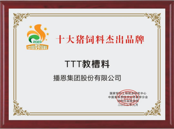 近日,在最新一季的“中國好豬料·第11季”評選活動中,播恩集團的拳頭產品——TTT教槽料成功獲得了“十大豬飼料杰出品牌”的榮譽稱號。這一榮譽不僅是對播恩集團在豬飼料領域卓越表現(xiàn)的認可,更是對播恩TTT教槽料品質與技術的高度贊賞。