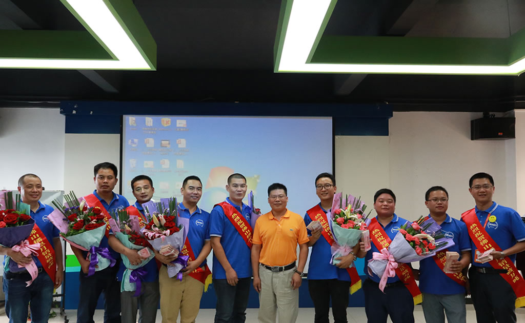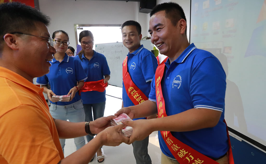 頒獎(jiǎng)儀式上,公司對(duì)達(dá)成本次萬噸目標(biāo)表現(xiàn)優(yōu)異的省區(qū)給予了相應(yīng)的表彰與獎(jiǎng)勵(lì)。隨后,曾紹鵬為獲獎(jiǎng)省區(qū)頒獎(jiǎng)。惠州省區(qū)、廣西大區(qū)、海南愛佑完成了月度銷量和總銷量兩項(xiàng)指標(biāo);肇慶省區(qū)、肇慶全價(jià)料、江門省區(qū)、粵西大區(qū)、梅州省區(qū)達(dá)成了月度目標(biāo)銷量,以上8個(gè)省區(qū)均獲得了現(xiàn)金重獎(jiǎng)。獲獎(jiǎng)代表們配上授帶,接過鮮花,展示著嶄新的一疊疊人民幣,整個(gè)會(huì)場(chǎng)充滿了歡呼聲與尖叫聲。